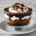 Top the trifle with a thick layer of the remaining whipped cream. Sprinkle chopped Heath or Skor bars generously over the top to add that signature toffee crunch and a touch of saltiness to balance the sweetness. Feel free to drizzle a little extra fudge sauce on top if you want to go all out.