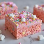 These Circus Animal Cookie Rice Krispie Treats are a fun and colorful twist on the classic marshmallow cereal snack. Packed with crumbled Circus Animal Cookies, mini marshmallows, and a double drizzle of white and pink-tinted white chocolate, this recipe is perfect for parties or anytime you want to add a playful touch to your treats. With bright sprinkles and nonpareils mixed in and on top, these bars are as visually delightful as they are delicious.