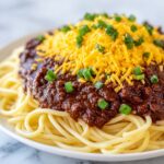 To serve, plate a generous portion of spaghetti and ladle the rich Cincinnati chili on top. Don’t forget the classic toppings like shredded cheddar cheese that melts into the saucy chili, and fresh chopped onions that add a bold crunch. Optionally add kidney beans or a dash of hot sauce if you love some extra texture or spice. This final step brings your Classic Cincinnati Chili with Spaghetti and Toppings Recipe to life, inviting everyone to dive into this comforting, flavorful feast.