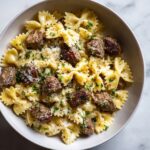 This Creamy Beef and Bowtie Pasta is a comforting and hearty dish perfect for a quick weeknight dinner. Ground beef is cooked with onions and garlic, then simmered in a rich, creamy cheese sauce made from beef broth, heavy cream, cheddar, and Parmesan cheeses, all tossed with tender bowtie pasta for a satisfying meal. Garnished with fresh parsley, it’s an easy-to-make recipe that offers a delicious blend of savory flavors and creamy textures in just 30 minutes.