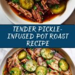 This Tender Pickle-Infused Pot Roast is a comforting American main course featuring a chuck roast slow-cooked to fall-apart tenderness with the unique tangy flavor of dill pickle juice and chopped pickles, complemented by savory vegetables and aromatic spices.